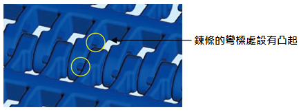 - 鏈條上表面採(cǎi)用特殊凹凸形狀,可起到防滑作用。採(cǎi)用該形狀,即使在鏈條上表面上作業(yè)也不易打滑、不易勾住。還可用於載客輸送機(jī)等